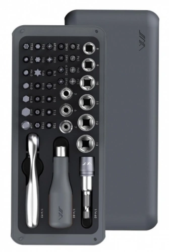 - Инструменты в комплекте: 28 бит, 9 торцевых головок, адаптер для головок, удлинитель, отвертка и трещотка